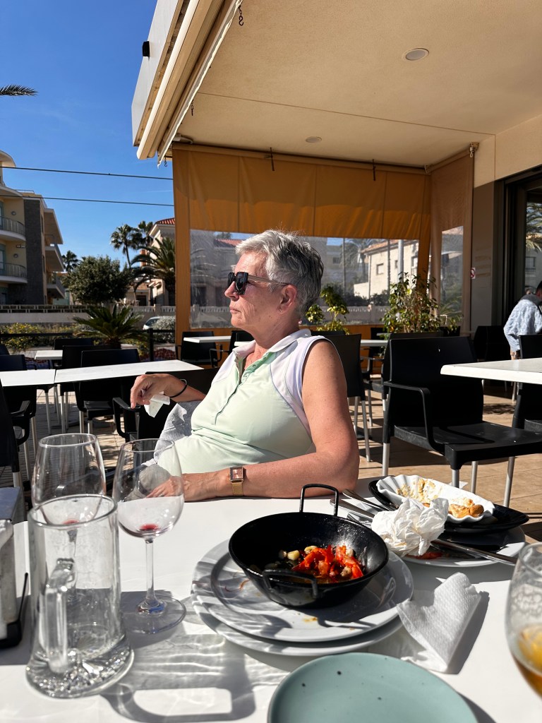 By lunchtime, priorities shifted from clothing failure to food success. We crossed the road to our now-official local beach restaurant called appropriately the Costa Blanca. The staff welcomed us like long-lost family members (the kind you’re actually happy to see), beers and tapas were ordered, and we settled into the sun with the smug comfort of people who have nowhere important to be. Peak holiday energy.