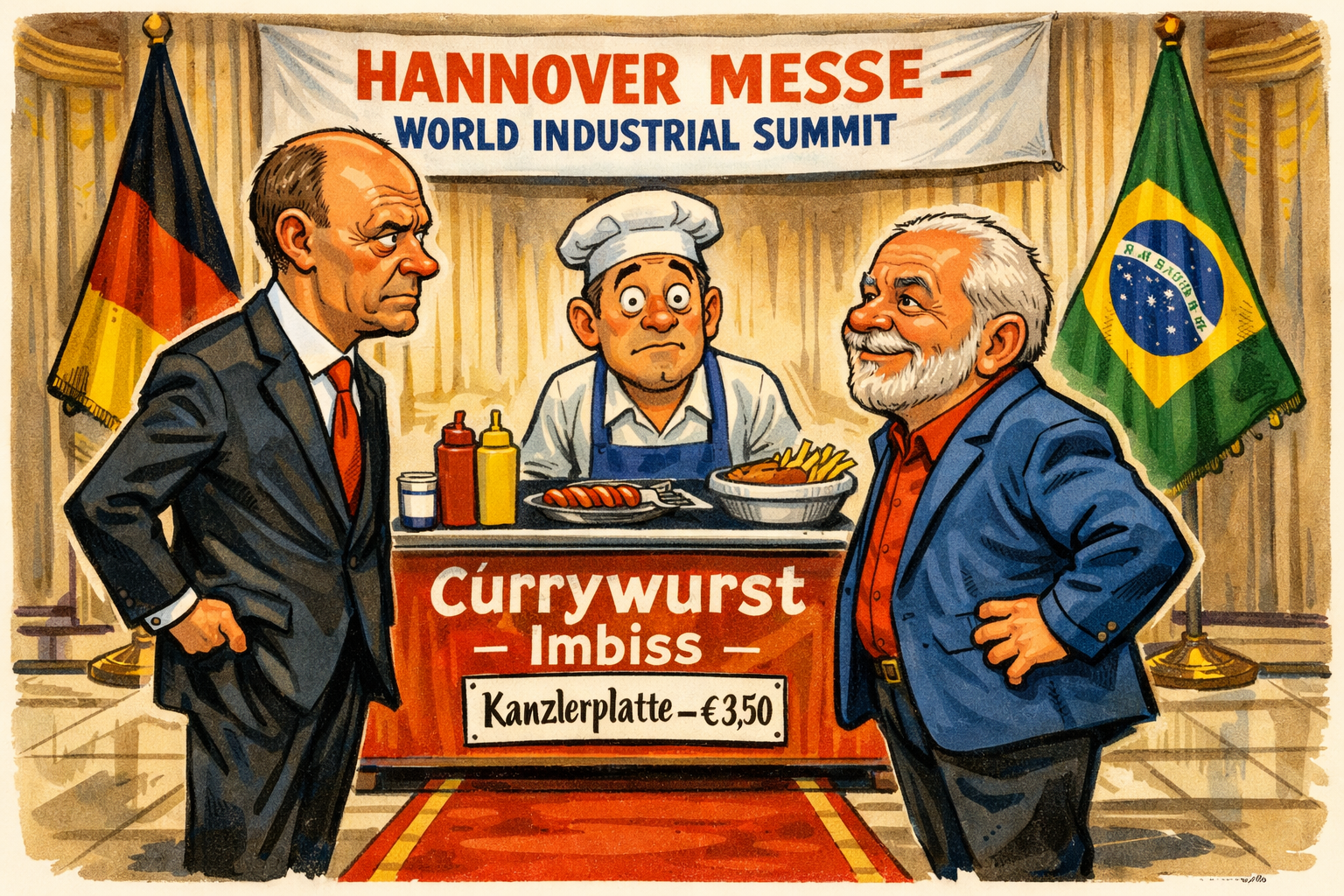Eilmeldung aus den höchsten Sphären der internationalen Diplomatie: Bundeskanzler Friedrich Merz steht vor seiner heikelsten Mission — eine anständige Straßenwurst in Hannover auftreiben, bevor Brasiliens Präsident Lula da Silva irgendetwas merkt.