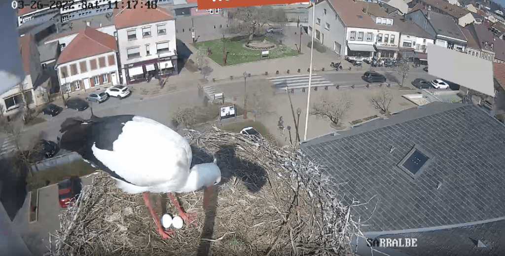 The storks came back a few weeks ago and have been busy rearranging the old nest. A few days ago the first egg was laid but the female stork broke it apart on purpose a few hours later and threw the shell bits away.