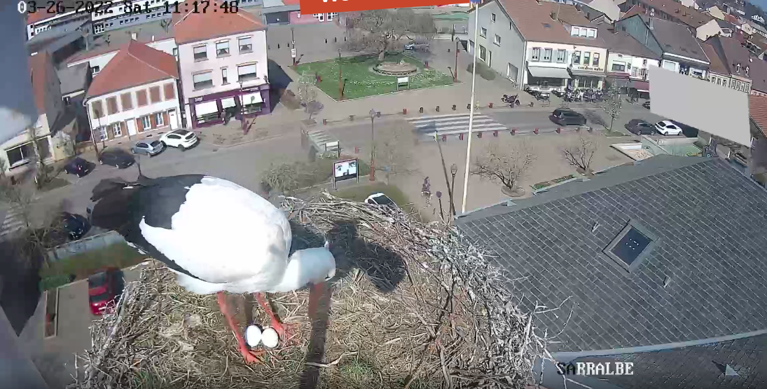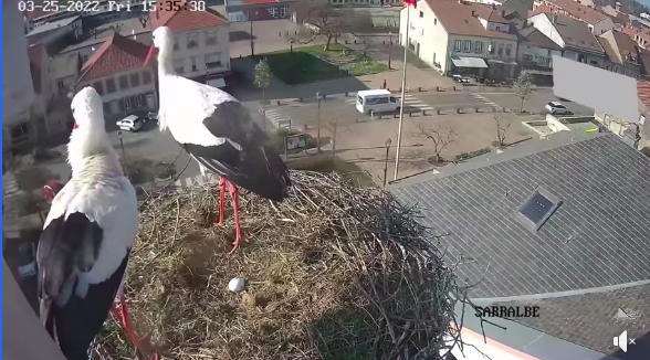 The storks came back a few weeks ago and have been busy rearranging the old nest. A few days ago the first egg was laid but the female stork broke it apart on purpose a few hours later and threw the shell bits away.