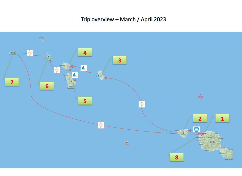 The plan is to visit a few islands in the Society Archipelago of French Polynesia. We shall transfer from one to the other by plane and we have also added a 4 days cruise in a private catamaran with crew / guide and cook on board.