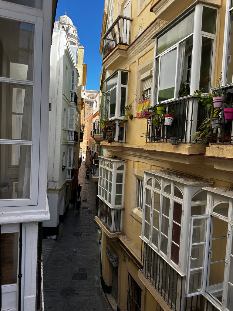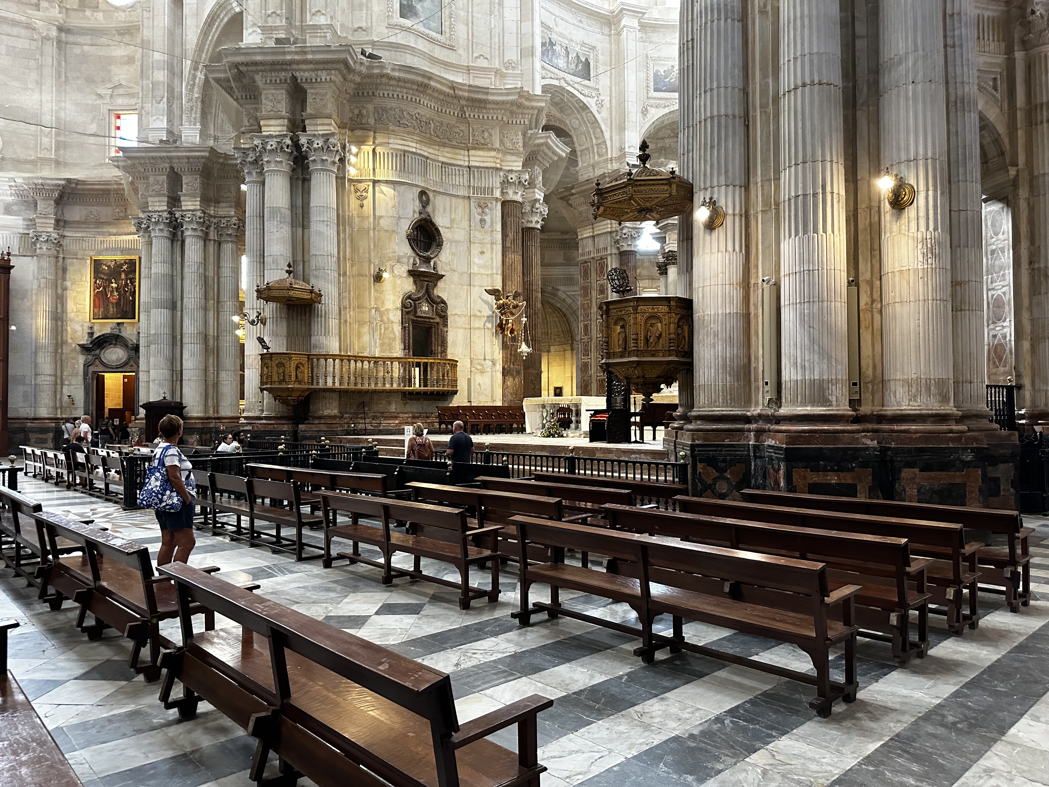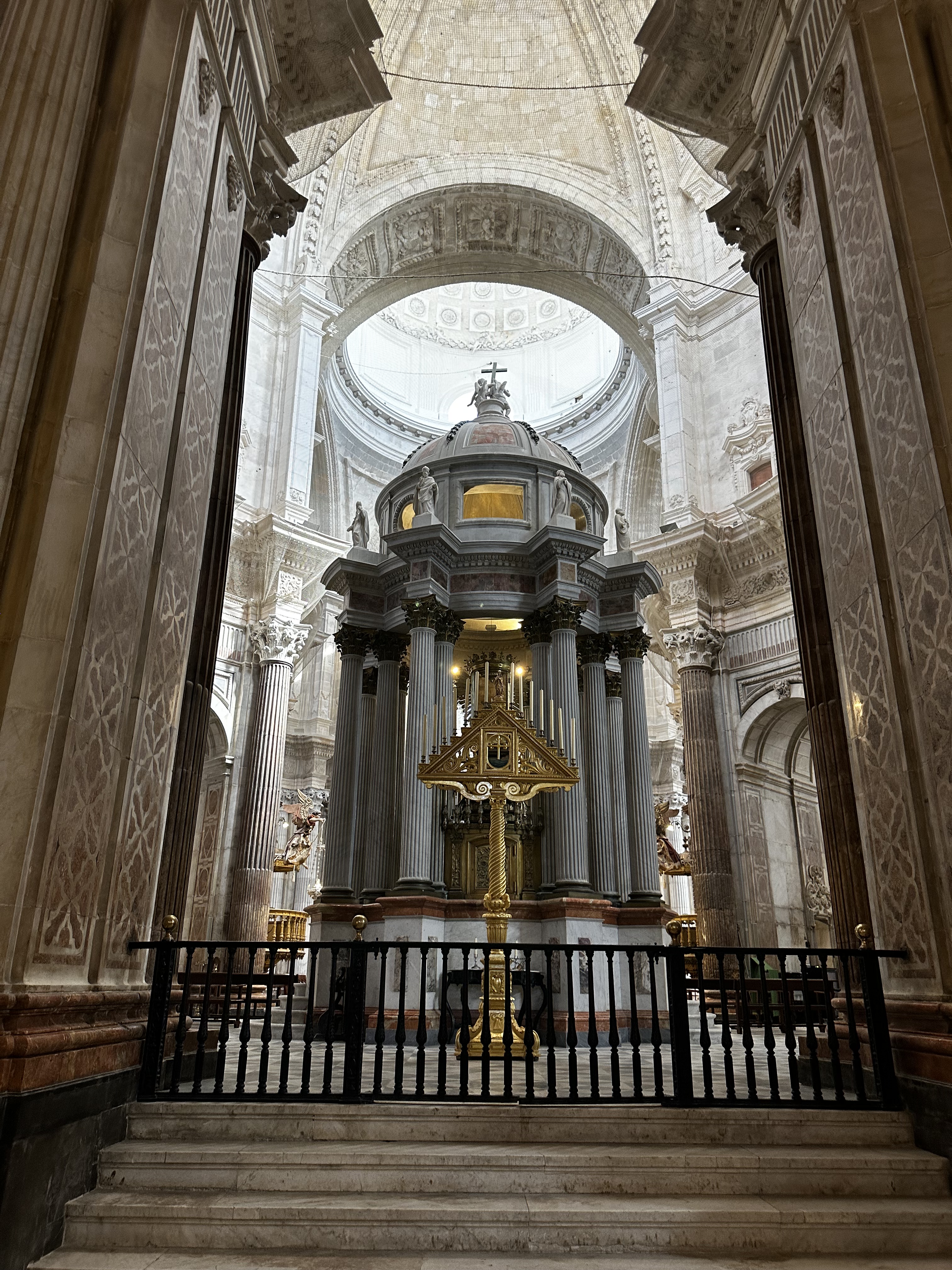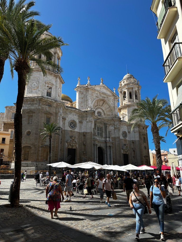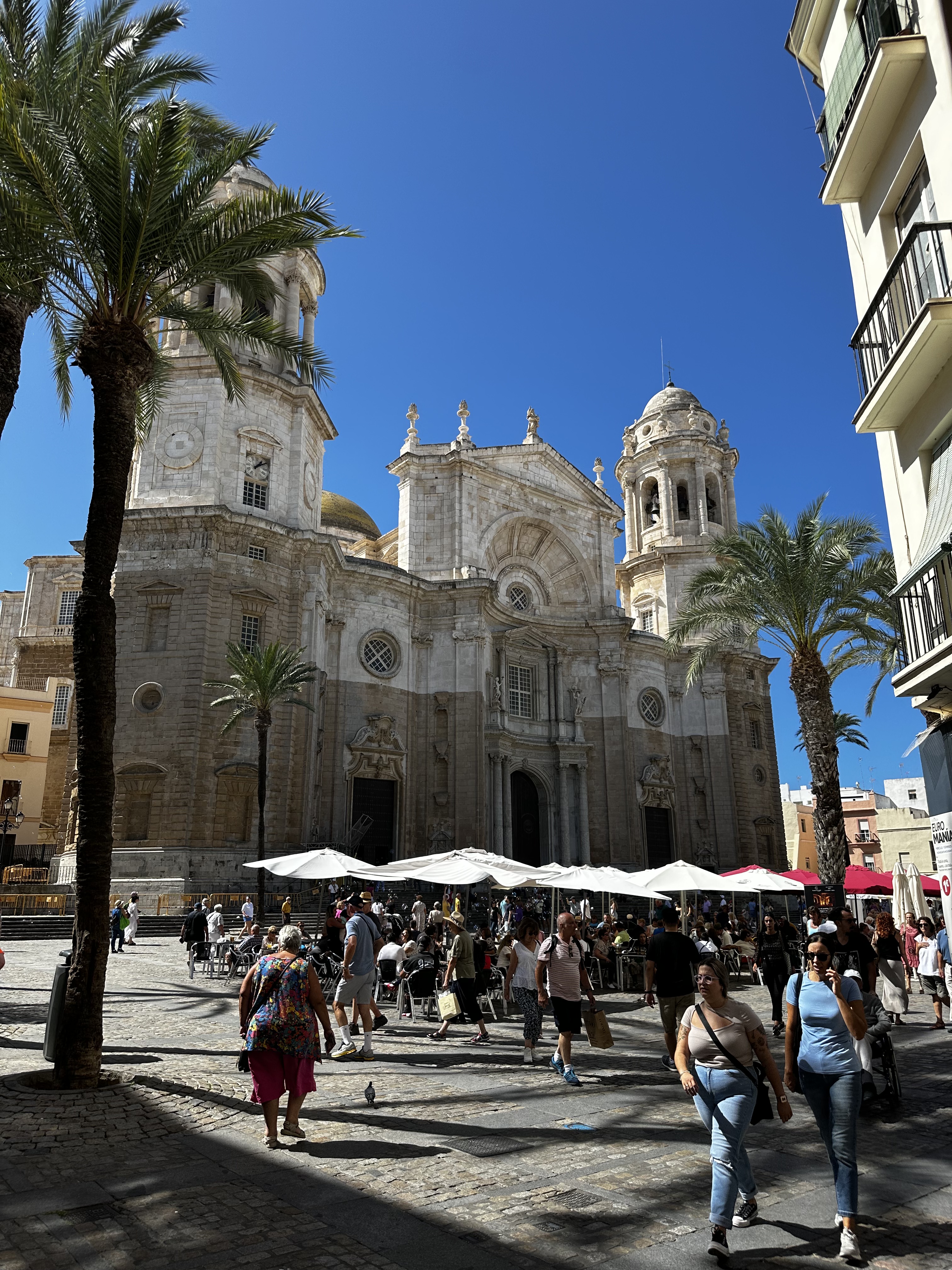 Going to Cadiz has always been in the back of my mind. I drove past a few times but never actually stopped. This time we are there for 2 nights. We arrive in town a little bit too early to take possession of the appartment. Not a problem, the car is securely parked by the sea front, the appartment is a 100 metres from the main Cathedral and the plazza in front of the said Cathedral is full of tourists and bars and restaurants. We select one for a few drinks and tapas to share for lunch.