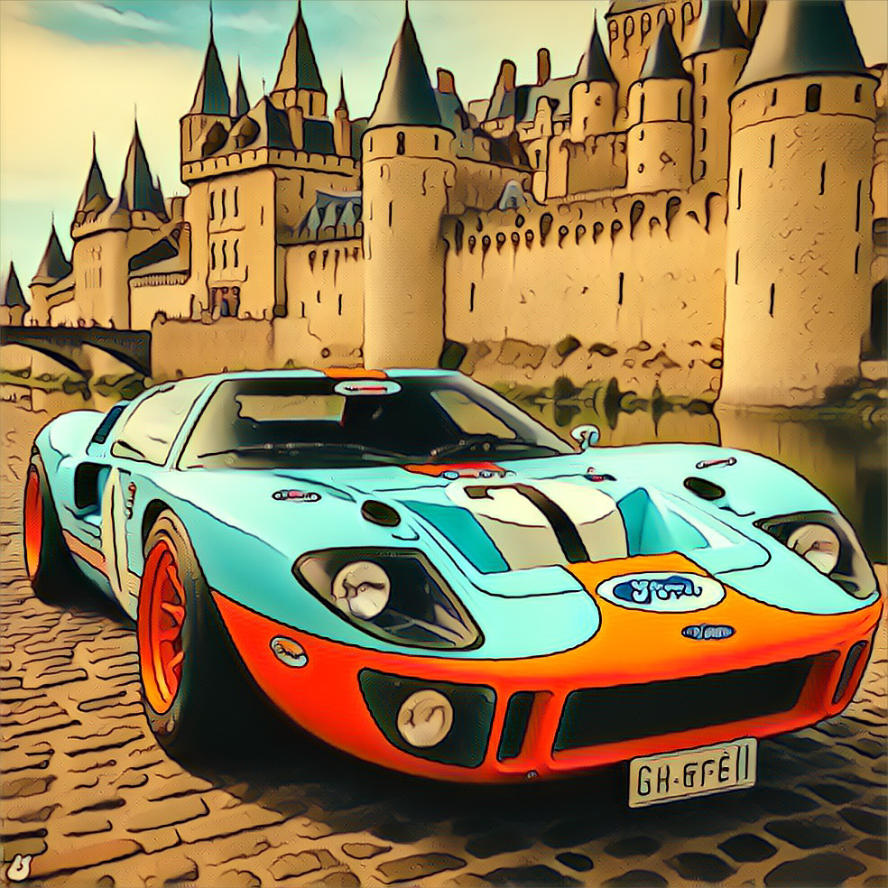 In this particular case I prompted AI to draw a Ford GT40 in the Gulf livery parked in front of the old Cité of Carcassonne. I transformed the result into a cartoon myself with some of my favorite applications.
