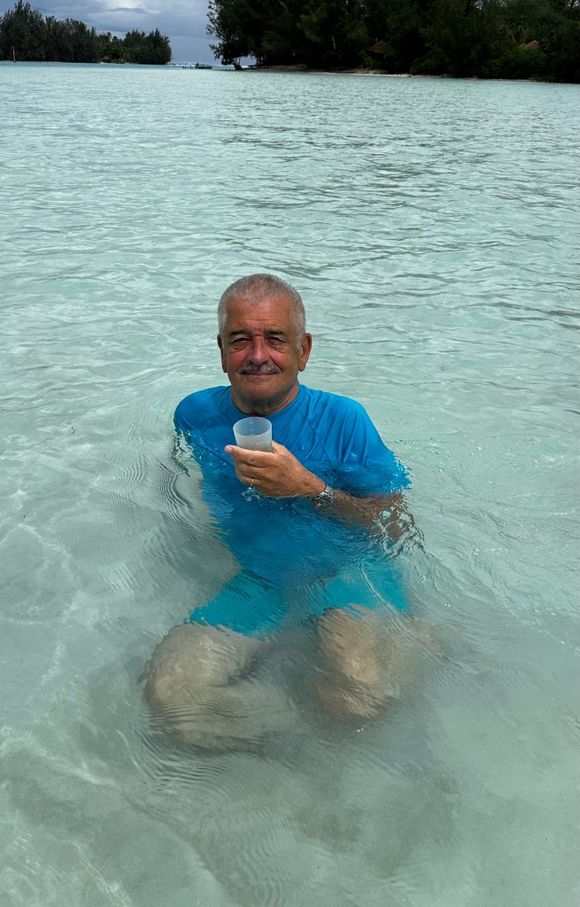 Out comes the homemade punch — best served standing in thigh-high ocean while being casually circled by curious manta rays. They kept a polite distance, because even manta rays respect cocktail hour.