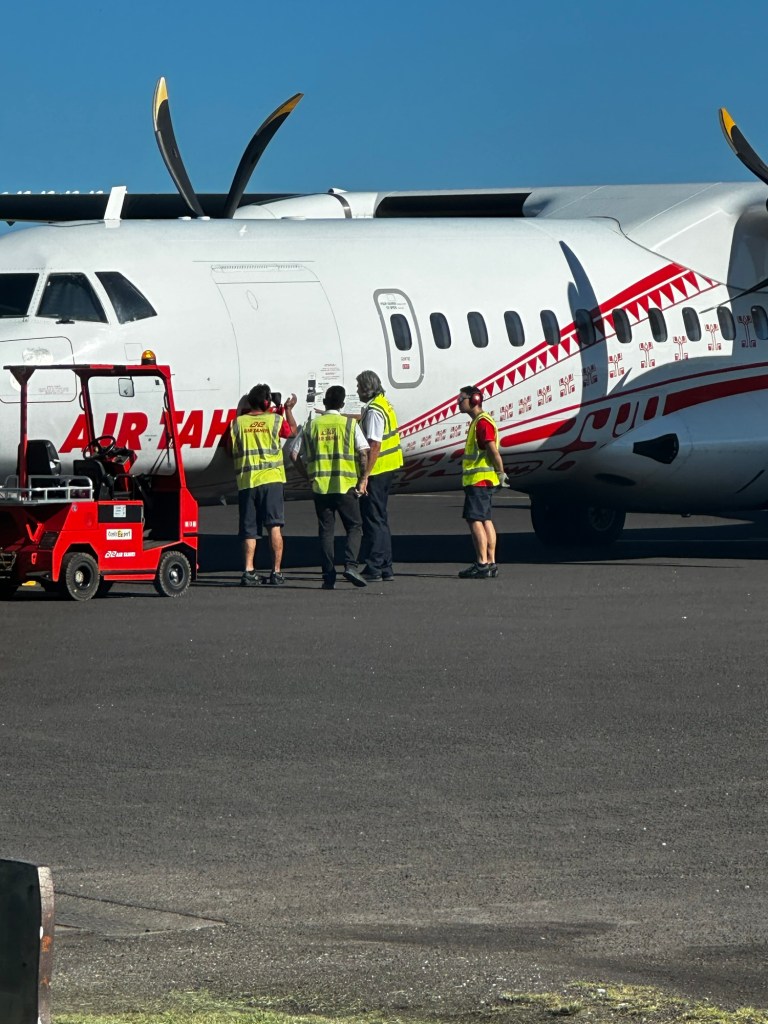 Upon arrival, we’re treated to the thrilling spectacle of baggage handlers in an intense battle with the cargo door. It’s man versus metal, Polynesian edition.