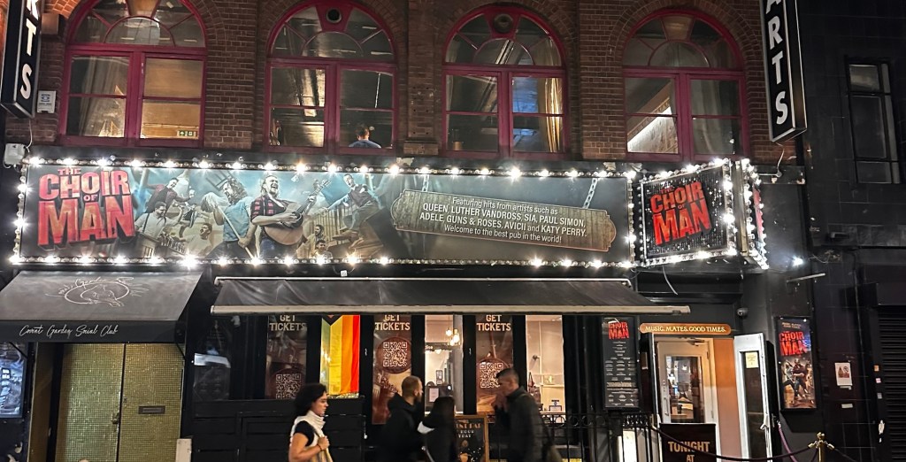 Nous arrivons – miracle – en avance. Ce qui signifie une seule chose : il y a largement le temps pour une pinte au pub d’à côté. Efficacité britannique de très haut niveau. À 19h pile nous sommes dans The Arts Theatre, verre à la main tels des habitués du West End (pas besoin de gobelets jetables touristiques, merci). Nous prenons place et ce qui suit n’est rien d’autre qu’un petit bijou inattendu : une comédie musicale feel-good appelée The Choir of Man. Je n’ai pas autant ri, souri, tapé du pied et approuvé sentimentalement depuis longtemps. Une pièce qui redonne foi en l’humanité, l’amitié masculine et les harmonies vocales, tout ça en 90 minutes joyeusement parfaites.