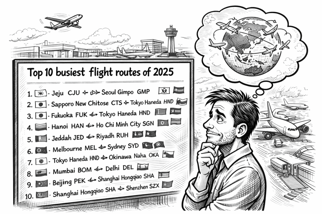 While wandering through various “year in review” web pages, I stumbled upon a list that immediately caught my attention: the ten busiest flight routes of 2025. What struck me first was not the numbers, but the geography. Remarkably, every single one of them is located in the Asian region. Not a single transatlantic hop, no European shuttle, no New York–Los Angeles in sight. Just Asia, Asia, and more Asia.